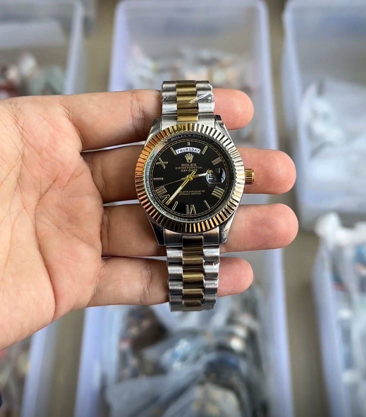 Black And Gold Dial Day Date Bracelet Watch For Men
