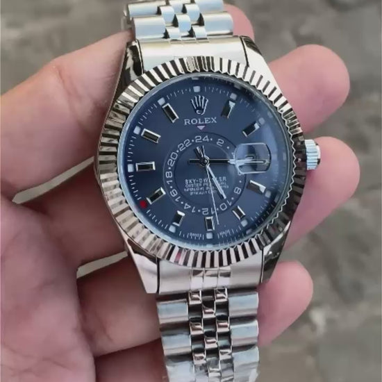 Silver Blue Sky Dweller Analog Dial Dual Tone Stainless Steel Luxurious Watch For Men